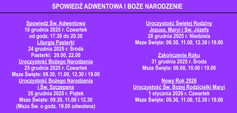 SPOWIEDŹ ADWENTOWA I MSZE ŚWIĘTE W OKRESIE BOŻEGO NARODZENIAPost author:AgnieszkaPost published:14/12/2025Post category:Ogloszenie Please Share This Share this content Opens in a new window Opens in a new window Opens in a new window Opens in a new window Opens in a new window Opens in a new window Opens in a new window Opens in a new window Opens in a new window Opens in a new window Może ci się spodobać również Jak dbać o bezpieczeństwo swoje oraz innych podczas przebywania na terenie Kościoła w czasie pandemii20/10/2020 Wiadomości parafialne z 5 października 202504/10/2025 Koronawirus aktualizacja 28/10/202028/10/2020